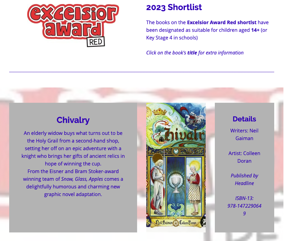 We’re incredibly thrilled and honored that Neil Gaiman’s Chivalry is shortlisted for the Excelsior Award, to be decided by the children of hundreds of schools in the UK.